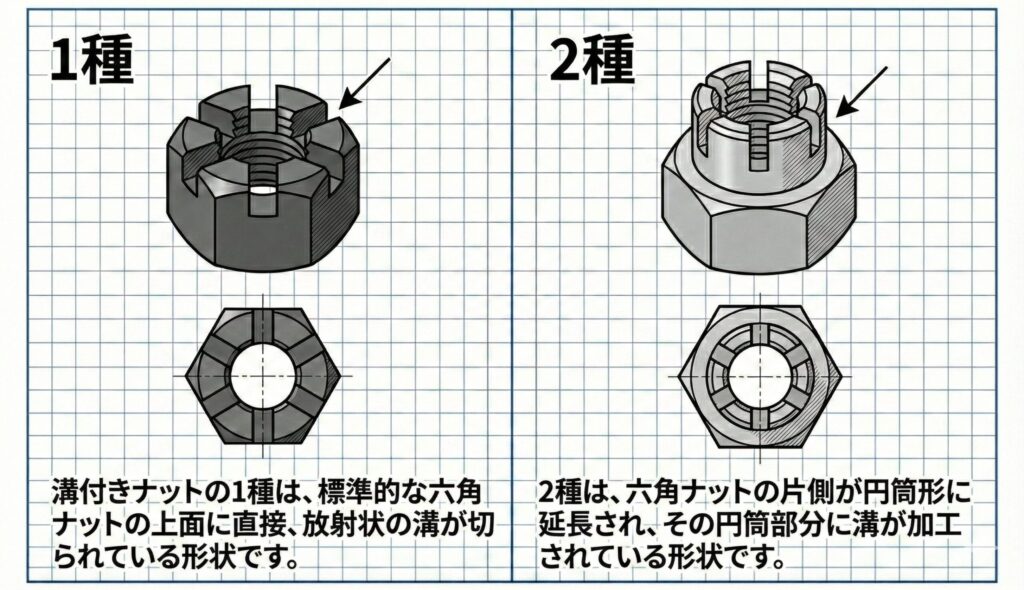 溝付きナットは、その形状や構造によってJIS規格(JIS B 1185)で複数の種類に分類されています 。設計エンジニアが製品を選定する際、特に重要となるのが「1種」と「2種」の使い分けです 。これらは六角部の構造が異なるため、締結箇所のスペースや要求される安全性、作業性に応じて適切に選択する必要があります。